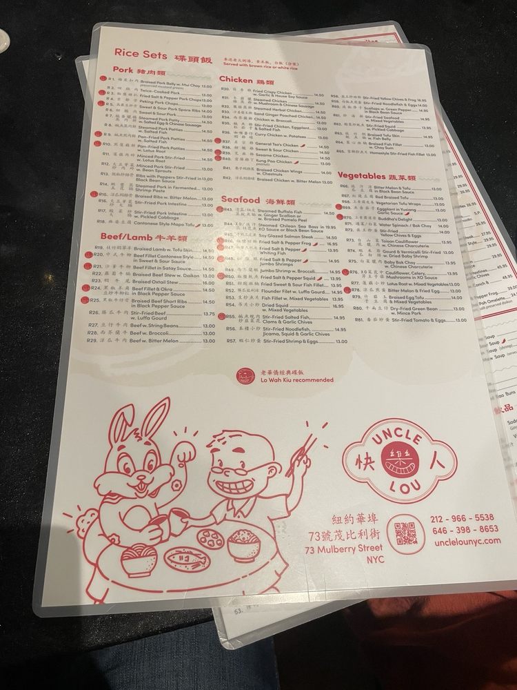 Uncle Lou 快樂人 in Chinatown, New York, offers a modern twist on traditional Cantonese cuisine. With a variety of options including Pescatarian and Vegan dishes, the menu is sure to please all palates. Customers rave about the generous portions and authentic flavors of dishes such as Peking Pork, Stuffed Eggplant, and Crispy Garlic Chicken. The attentive service, inviting ambiance, and affordable pricing make Uncle Lou a standout in the bustling neighborhood. Don't miss out on trying the Coconut Walnut Shrimp, Ginger Rice, or the Steamed Buffalo Fish with Ginger and Scallion. Whether you come for brunch, lunch, or dinner, Uncle Lou is a must-visit spot for delicious Cantonese fare in Lower Manhattan.
